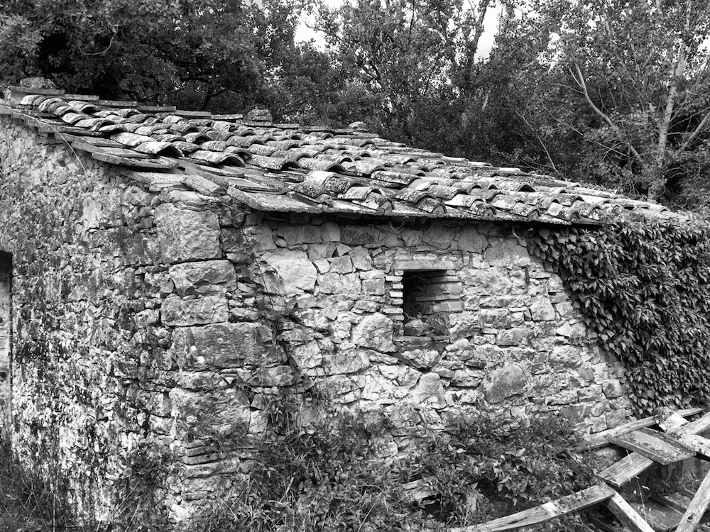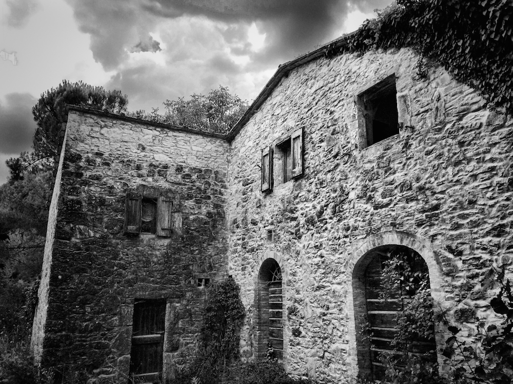 As we were rolling along, just out of nowhere, but close to the town of Radda in the Chianti region, we came across an abandoned house made of stone. From the road you could just see this ruin, shyly peeking out of from beneath the thick brush and a covering forest that had been left to rampage. It made a wonderful sight — striking enough for us to stop, pull out our iPhones, and go snap, snap, snap.