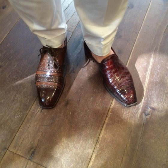 I met Riccardo two years ago at my friend Steven Taffel’s temple of men’s shoes, Leffot. We got along famously. I loved his natural talent, his honesty and directness, but most importantly, his gentle manner in which he pointed out why you might be wrong about your choice. We collaborated on a pair of shoes that sit in my closet, still in the original greet velvet encased box. The workmanship on those handmade shoes was exquisite and perhaps it will be unmatched. I am unlikely to wear them ever – for they will be momentos of Ricardo’s memory.We had plans to work on another pair – a nice boot — but his illness prevented him to work on new pairs. It would now remain a dream.