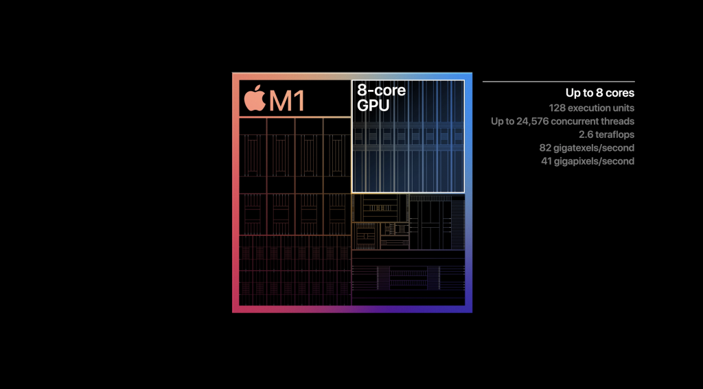 By building a higher-end integrated graphics engine and marrying into the faster and more capable universal memory architecture, Apple’s M1 can do more than even the machines that use discrete GPU chips, which have their specialized memory on top of normal memory inside the computer.
