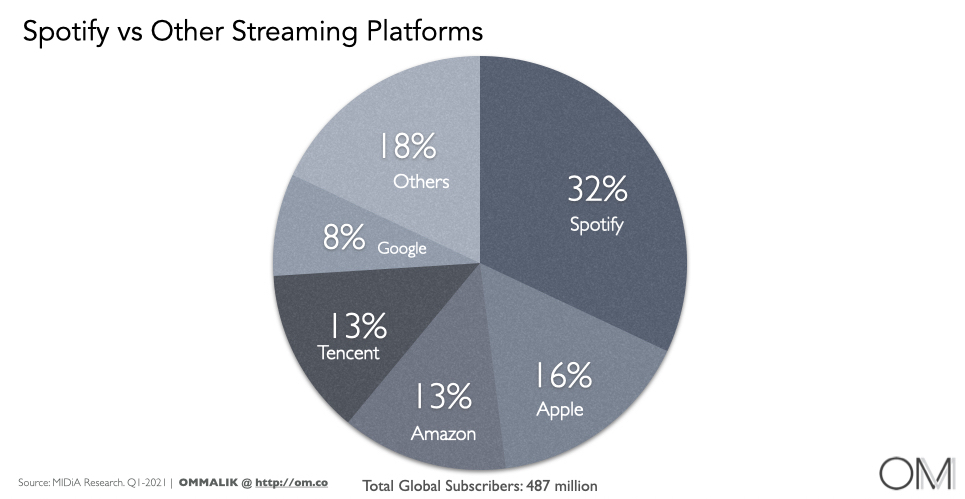 Spotify continues its global dominance, adding 27 million net subscribers between Q1 2020 and Q1 2021, more than any other single service. However, it lost two points of market share over the period because its percentage growth rate trailed that of its leading competitors.