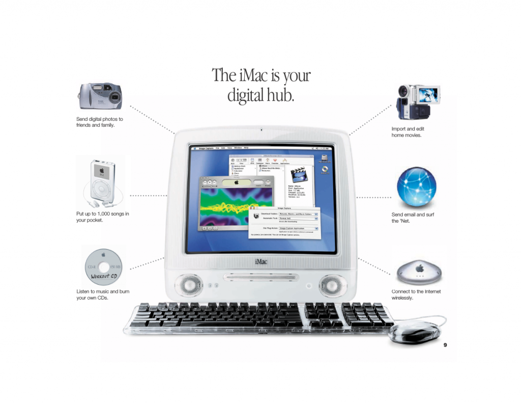 Apple wanted Mac to be at the center of a digital lifestyle. Mac was your digital hub. Jobs would repeat on every occasion. It would be a place to get your music, your photos, your home videos, connect to the Internet, and all the other things. Maybe knowingly (but more likely unknowingly), Apple had made a device that made it easy for normals to understand and embrace our then-new century’s big idea: the abstraction of our physical life into the digital domain.