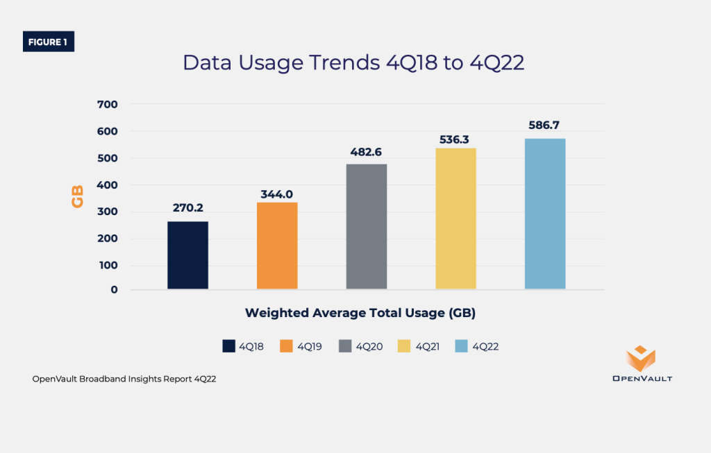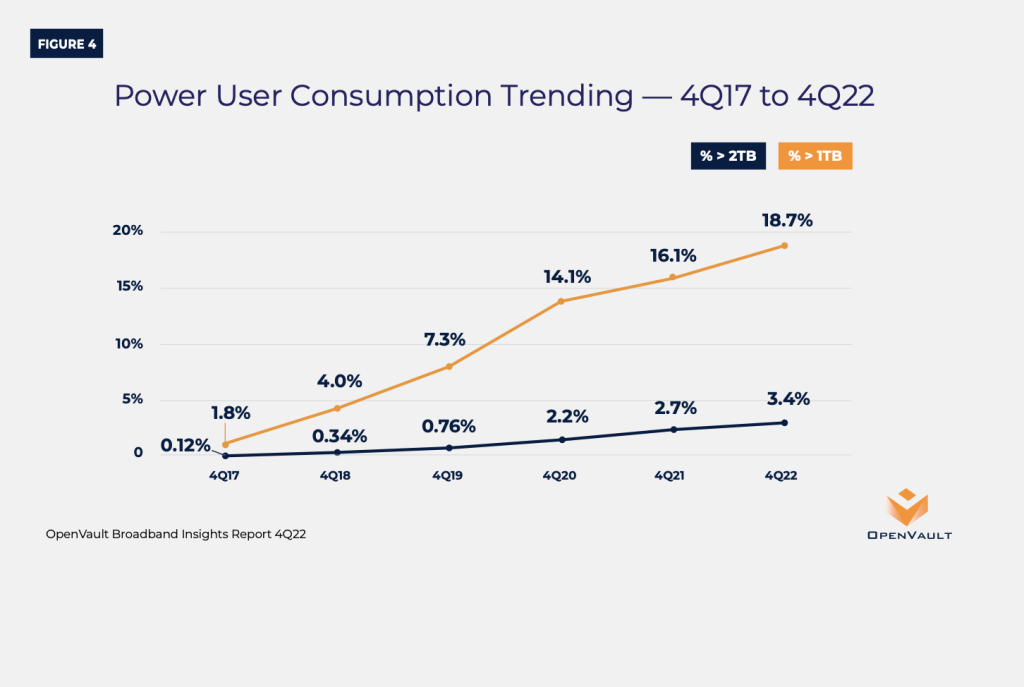Higher speeds mean more data consumption by households. With more of us opting for streaming video over traditional cable networks, it is not surpassing. The average per-household data consumption was 586.7 GB at the end of 2022, an increase of nearly 10% over the prior year. The power users — are consuming more data. OpenVault notes that the power users consuming one terabyte or more per month in 4Q22 was 18.7%, a year-over-year increase of 16% and ten times the percentage observed just five years ago, at the end of 2017. What’s more astonishing is the growth of superusers (ahem, folks like me) who consume two terabytes or more per month. Their numbers increased 25%, from 2.7% to 3.4% — a nearly 30 times increase within the past five years.