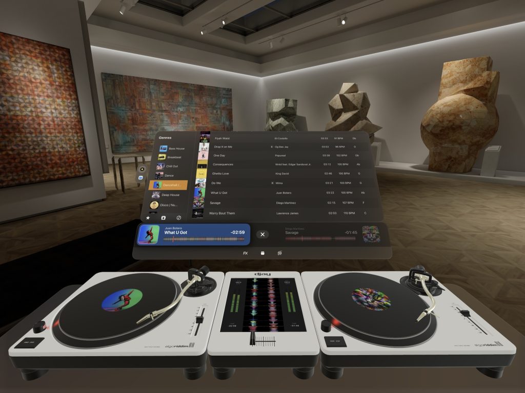 Algoriddim’s Vision Pro app marries the ease of use of software and the realism of a proper deejay booth set-up. And the whole setup works just as you would expect it to work in the real world. The sliders, the fader, the special effects, and ability to control the records. It didn’t take long for me to fall back into the all too familiar mixing routine — much to the amusement of the Apple folks who were in the room.