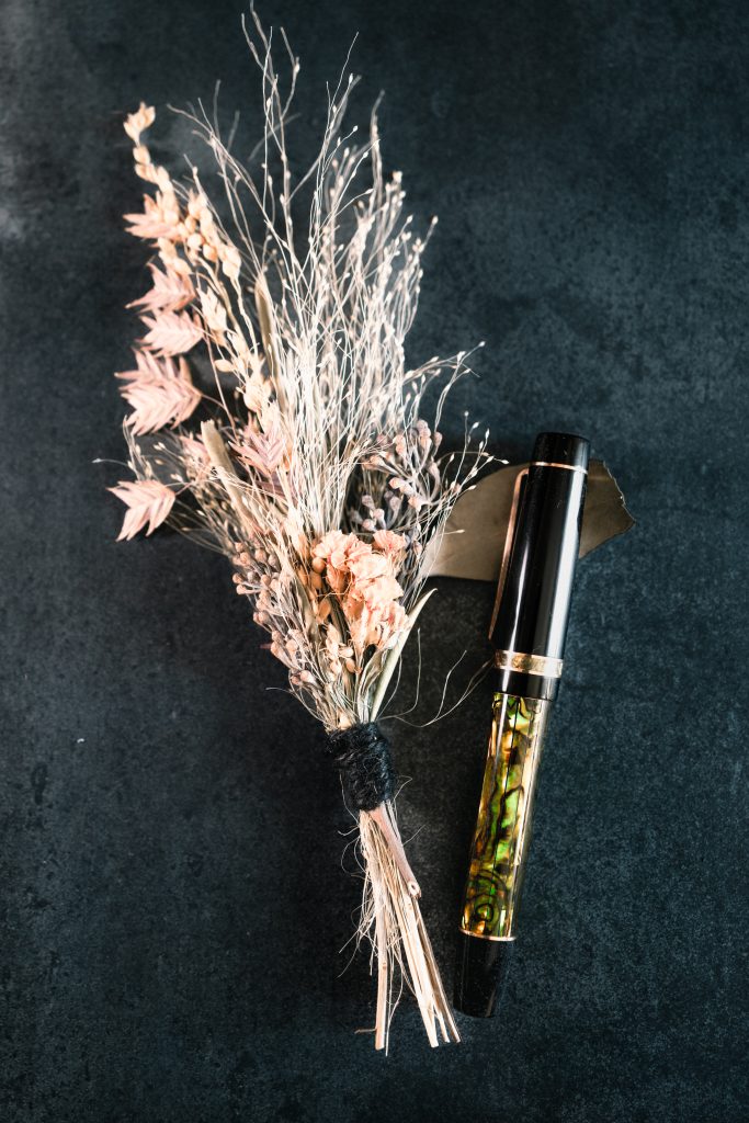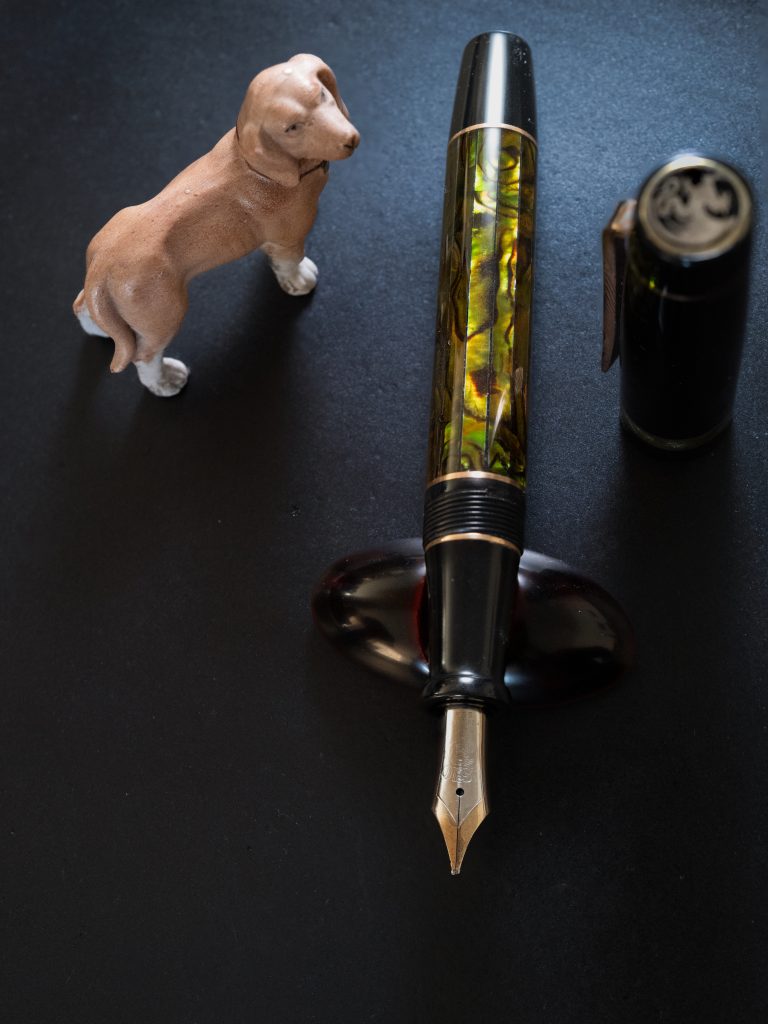 I had a red-letter day coming up and wanted to buy something special. When Eric shared a “work in progress” photo of this green-gold-black pen, I knew this was it. After some discussion, I found myself the owner of a Carina Hapalua 15 — made of green and gold abalone and black alumlight resin, fitted with a bronze Mokume Gane clip.