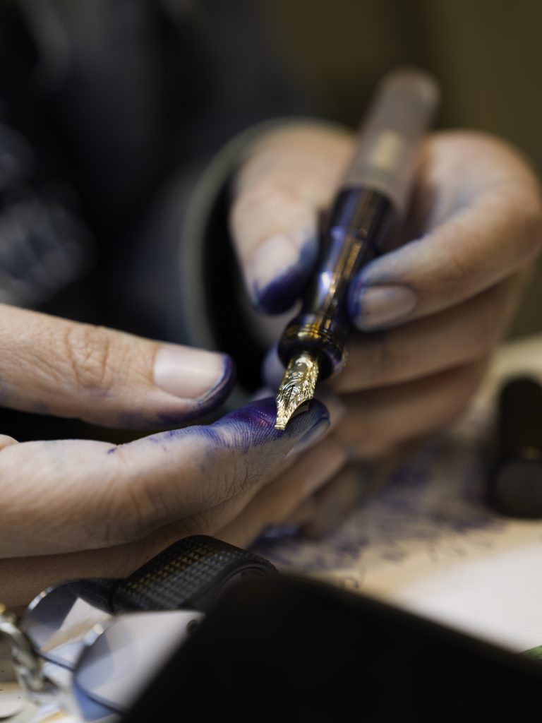 Her blue ink-stained hands are a legend in themselves. Initially, the nib was destined for one of my favorite Kasama pens, but after a little deliberation, I ended up moving it to this creation by Vivek Kulkarni of Urushi Studio India called “The Sea and Sky.” The pen tells the story of two ducks helping move a tortoise from a desert to the land where there is water.