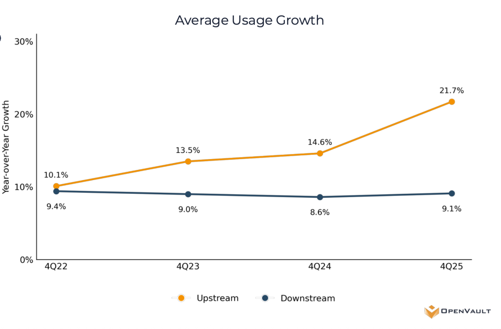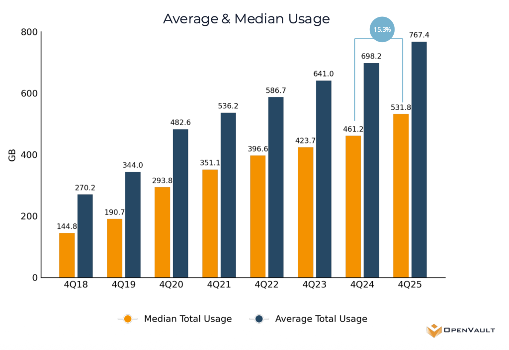 According to the latest OpenVault Broadband Insights report, upstream usage surged 21.7% year-over-year in 2025, the fastest-growing metric. In a side-by-side comparison of fiber and DOCSIS subscribers, fiber subscribers with symmetrical 677 Mbps service consumed 93 GB of upstream bandwidth in Q4 2025. DOCSIS subscribers provisioned at an average of 17 Mbps upstream, used 56 GB. That’s a 66% gap, on identical customers, explained almost entirely by what the network allowed them to do. OpenVault concluded that latent upstream demand already exists on DOCSIS networks. People will use the pipe if you give it to them.