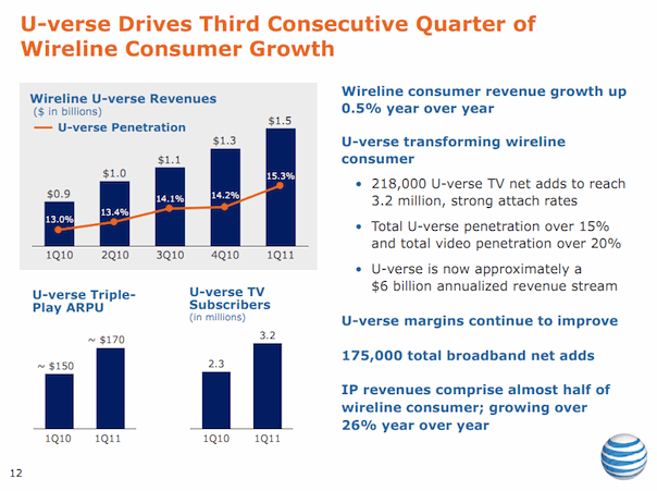 During the first quarter of 2011, the Dallas-based company added 175,000 new wireline broadband connections, down a whopping 31.4 percent from 255,000 new additions during the first quarter of 2010. When compared to the fourth quarter of 2010, wireline broadband additions fell 20 percent. Leichtman Research Group estimated that AT&T had 16.3 million broadband subscribers at the end of 2010.
