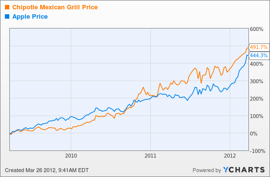 Earlier this morning we got an email newsletter from YCharts Pro that compared the stock of Chipotle Mexican Grill’s (s CMG), hot salsa of a stock performance with another red hot stock (and no I don’t mean the new iPad inventory), Apple(s AAPL).