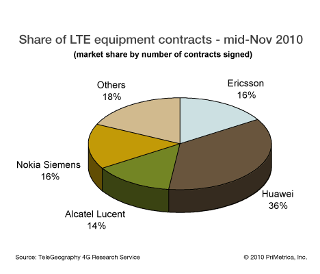 This time there is a new sheriff in town; Chinese vendor Huawei is one of the early leaders in the LTE sweepstakes. The company currently accounts for 36 percent of the contracts for LTE equipment, according to Telegeography, a market research firm. In terms of sheer size (and dollars), however, Ericsson is the big player as it has been supplying gear to some of the largest LTE-rollouts in the world.